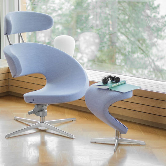 Die ausdrucksstarke Formgebung des Peels macht ihn zum Hingucker und Rückzugsort zugleich. Dank des integrierten Kippmechanismus bedarf es nur einer kleinen Gewichtsverlagerung, schon ist die Sitzposition geändert. Eine verstellbare Kopfstütze, die 360°-Drehung und der zugehörige Fußhocker machen den Sessel zu einem Alleskönner. Peel hat ein Aluminium-Fußkreuz und kann in verschiedenen Bezügen und Farben geliefert werden.