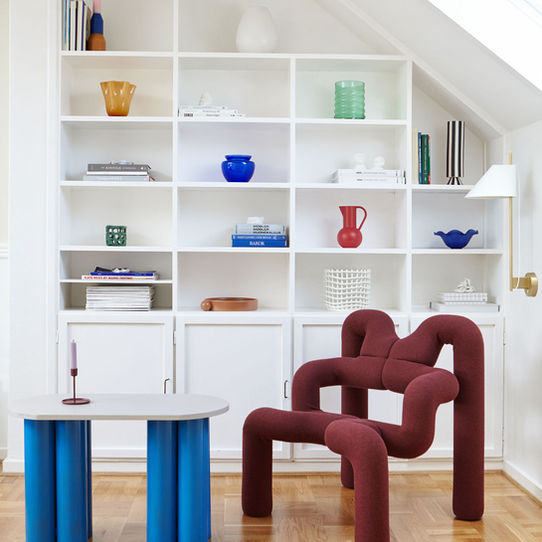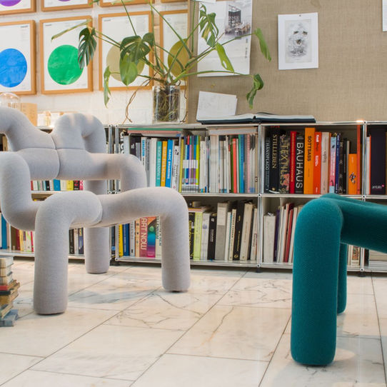 Ekstrem™ ist mehr als nur ein Stuhl, Ekstrem™ ist ein eigenständiges Objekt. Es handelt sich um eines der ersten postmodernen Designs Norwegens. Dank seiner unerwarteten Symmetrie kannst du mit den Füßen auf dem Boden nach vorne gerichtet, seitlich, mit den Beinen auf den Armlehnen, ganz umgedreht, mit der Vorderseite des Rumpfes oder auch gegen die Rückenlehne des Stuhls sitzen - ein vollkommen ungewöhnliches Sitzerlebnis. Ekstrem™ besteht aus einem Stahlrahmen, der mit weichem Schaumstoff und Wollstrick bezogen ist. Er ist in sechs Farben in Knit erhältlich, einem maßgeschneiderten Wollpolstertextil von Devold. Aus einem Faden gestrickt, bietet der Stoff eine Elastizität, die für die Anpassung an die organische Form des Stuhls unerlässlich ist. Die Strickware ist weich, atmungsaktiv und verfügt über ein klassisches quadratisches Muster.